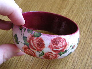 Kolejna odsłona biżuterii z drobnymi różyczkami. Ten sam motyw i kolorystyka co w "różanym ogrodzie" (kolczyki po przerobieniu: Z jednej pary dwie ). Właściwie komplet ten powstał pod wpływem komentarza na blogu odnośnie braku bransoletki. Powstała więc widoczna na zdjęciach obła bransoleta opleciona różami, choć bardziej pasowałaby z drewnianych korali to nie miałam ich akurat pod ręką, a bardzo spodobał mi się ten pomysł. Dlatego też ostatecznie postanowiłam zrobić nowy komplet niż dopasowywać idealnie pod tamten. Nowym elementem jest więc widoczne cieniowanie, które wchodzi pod różyczki. Kolczyki powstały z drewna które trochę u mnie leżało, dostałam je jako gratis do zamówienia i nie wiedziałam co z nim zrobić. W końcu znalazły swoje przeznaczenie. Są dwustronne. Moja babcia i chłopak niezależnie od siebie nazwali je "cukierkami odpustowymi".
